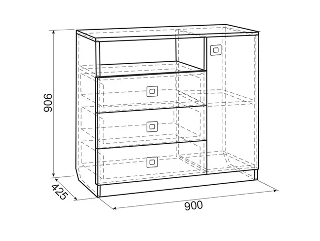 Состоит из 3-х выдвижных ящиков, ниши и полок с закрытой дверью.
