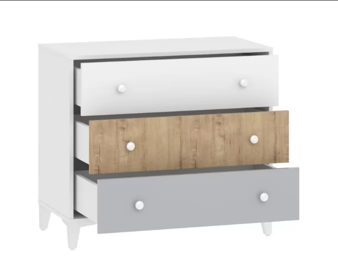Комод «Морти» - прекрасный выбор для интерьера в стиле Современный, Модерн, Скандинавский. Три удобных выдвижных ящика станут вместительным место для хранения белья, предметов одежды и аксессуаров. В оттеночной гамме мебели царит стильное сочетание современности, изюминкой модели являются цвета ящиков: белый, серый и дуб бунратти. Выдвижные ящики оснащены шариковыми направляющими полного выдвижения, равномерно распределяют вес содержимого и обеспечивают плавный бесшумный ход ящика. Высокие опоры зрительно облегчают конструкцию и более удобны для уборки.