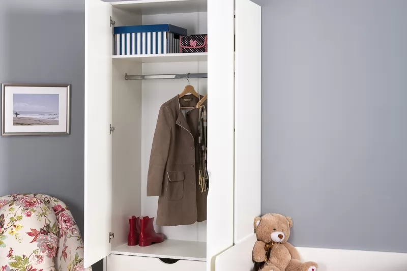 Удобный шкаф для одежды дополнен двумя выдвижными ящиками, что значительно увеличивает функциональность изделия.
