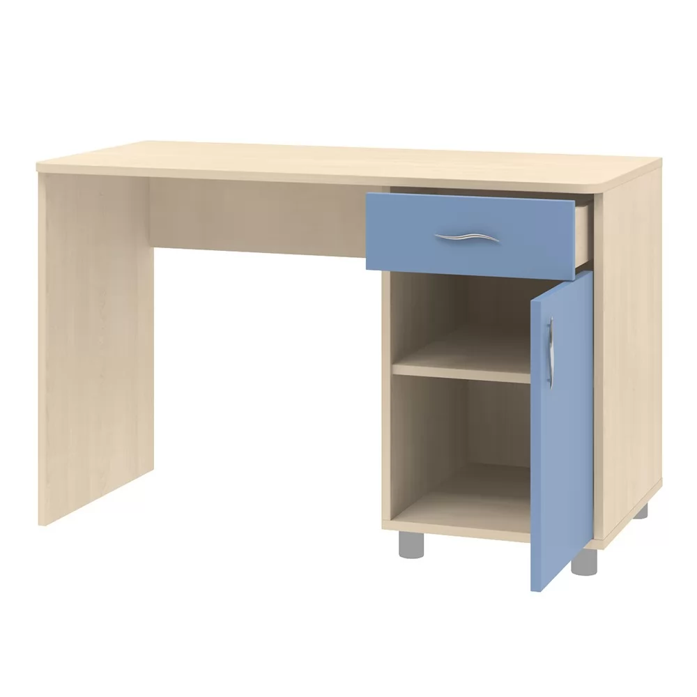 Письменный стол - это удобное рабочее место для детской комнаты. Этот предмет мебели включает в себя вместительный выдвижной ящик, а также за распашной дверью полка, на которых удобно хранить книги и канцелярские принадлежности. Стол универсальный, поэтому при сборке можно выбрать левое или правое расположение тумбы.