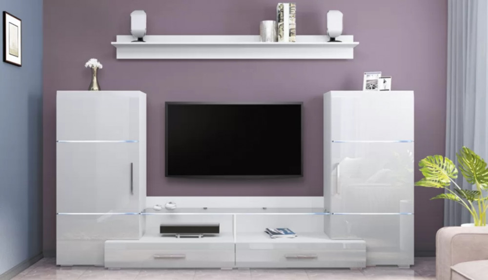 Шикарная глянцевая гостиная состоит из тумбы ТВ с двумя выдвижными ящиками, двух шкафов и навесной полки. Идеально подойдет для небольшой комнаты в современном стиле.