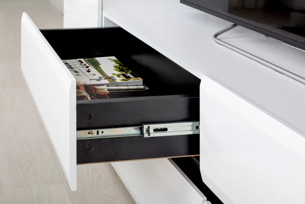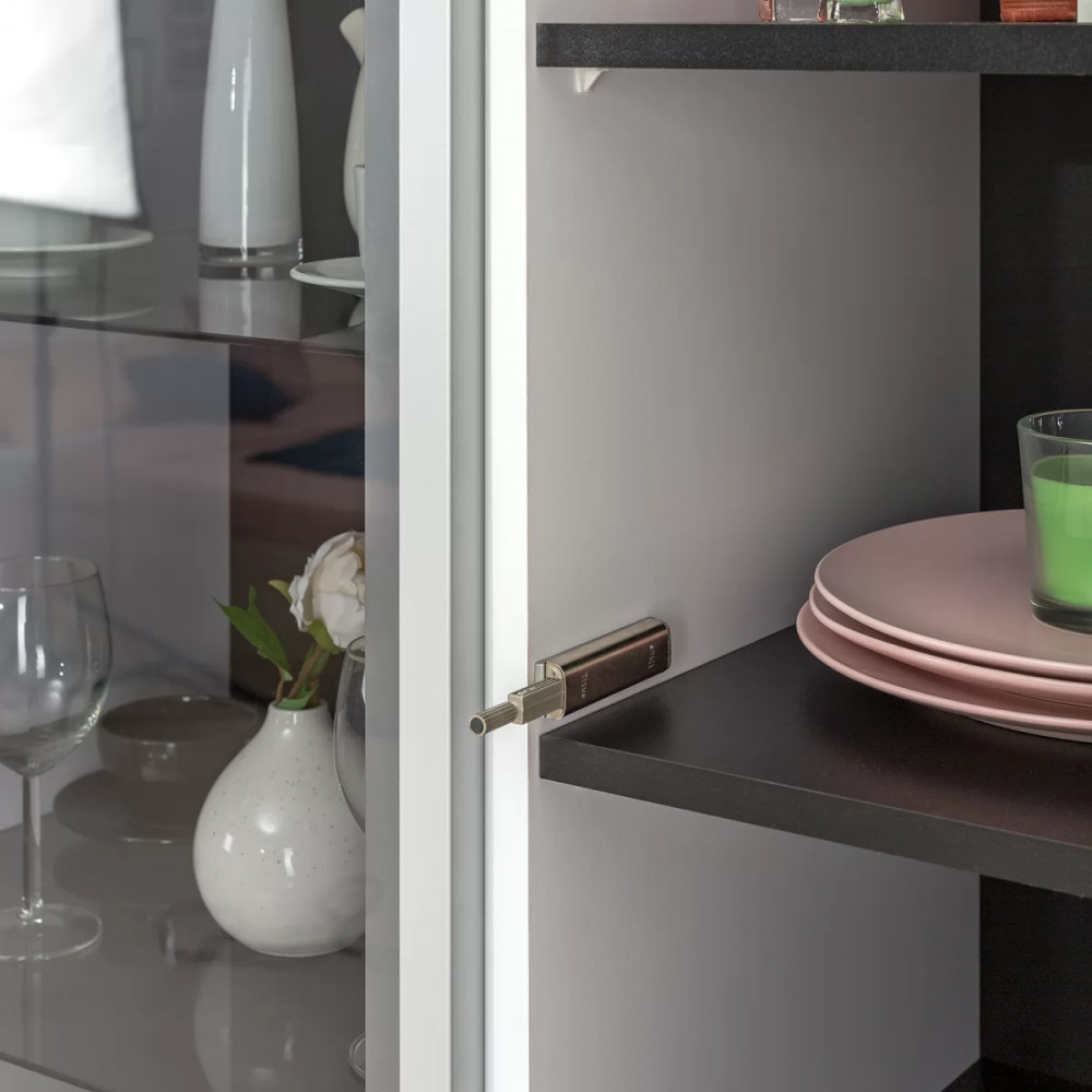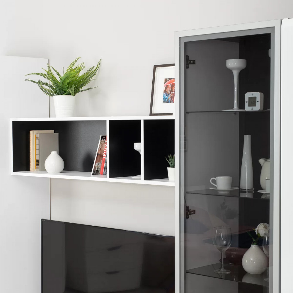 Лаконичные белые глянцевые фасады создают ощущение чистоты и свежести, лёгкости, свободного пространства. Акцентом выступают чёрные горизонтальные вставки между фасадами и серое тонированное стекло витрины. Фасады могут открываться за край, либо нажатием, с помощью механизма push-to-open. Все распашные фасады оснащены доводчиками, что обеспечивает плавное закрывание и исключает удар о корпус. Полка крепится к боковинам соседних модулей, собираю всю компоновку в единое целое. Задняя стенка чёрного цвета эффектно подчеркивает наполнение шкафов.
