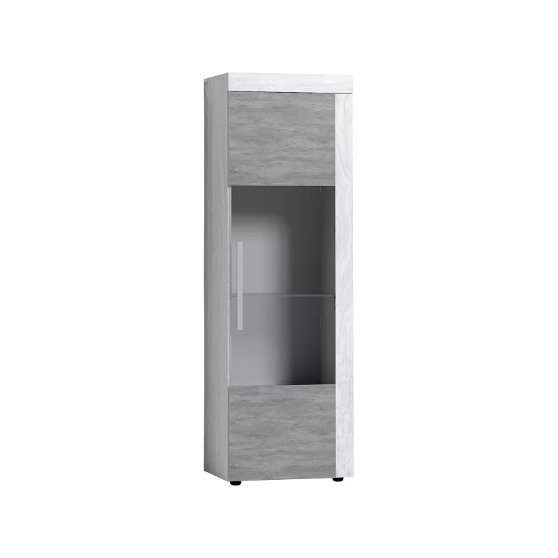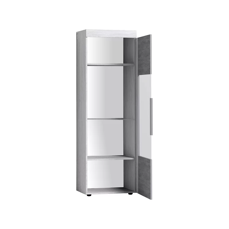 Если вы считаете, что хранить в гостиной посуду уже не модно, шкаф со стеклянной дверцей и стеклянными полками станет отличной витриной для дорогих и любимых фотографий и памятных вещиц. Стеклополки в обработке еврокромкой выдерживают до 10 кг каждая. Фасад перенавешивается на левую и правую сторону. Серебристая стильная ручка из массива дерева и серое тонирование стекло фасада вносят смелые дизайнерские штрихи в восприятии актуальноого декора "под бетон".