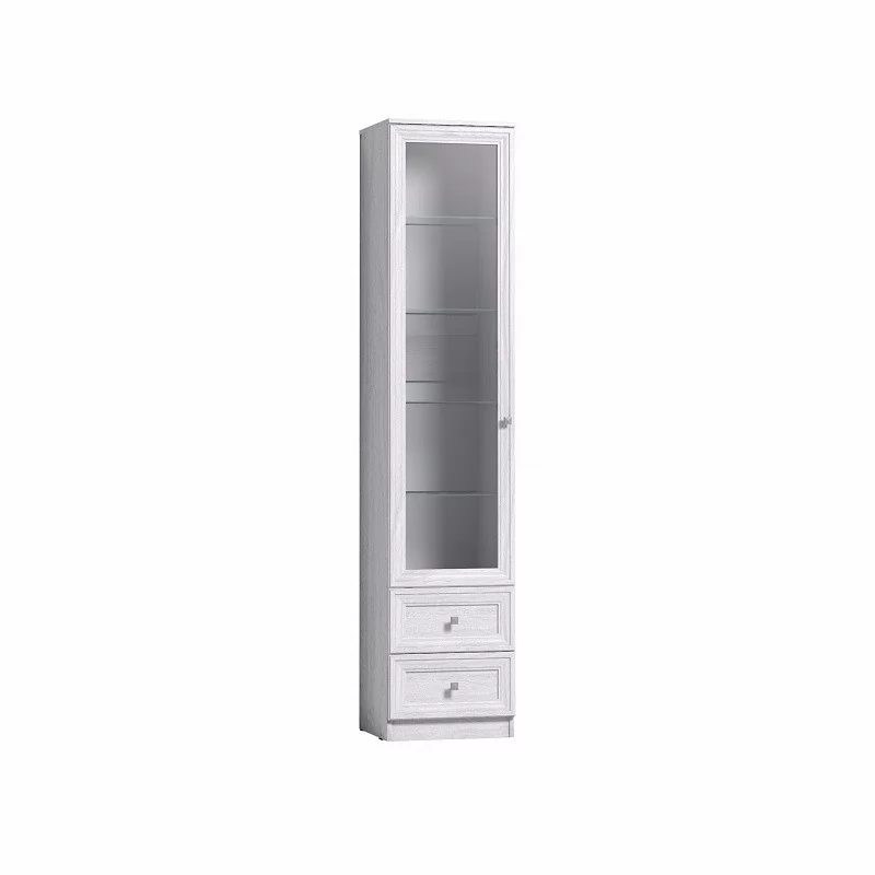 Элегантный шкаф для посуды PAOLA 13 станет украшением любой гостиной. Контрастное серое стекло в сочетании с белым декором Ясень Анкор светлый создаст эффект легкости и прозрачности в комнате, а рамочные фасады с маленькими ручками придадут мебели красоты и изысканности. На регулируемых по высоте полках разместите красивую посуду, антикварные вещи и сувениры, привезенных из дальних стран. Стеклянный фасад шкафа защитит милые сердцу вещи от солнечного света и пыли. Два выдвижных ящика хорошо подойдут для хранения столовых приборов и скатертей. Ящики оснащены шариковыми направляющими полного выдвижения и способны выдержать нагрузку до 15 кг. Сборка шкафа для посуды универсальная — его можно собрать как на правую, так и на левую сторону.