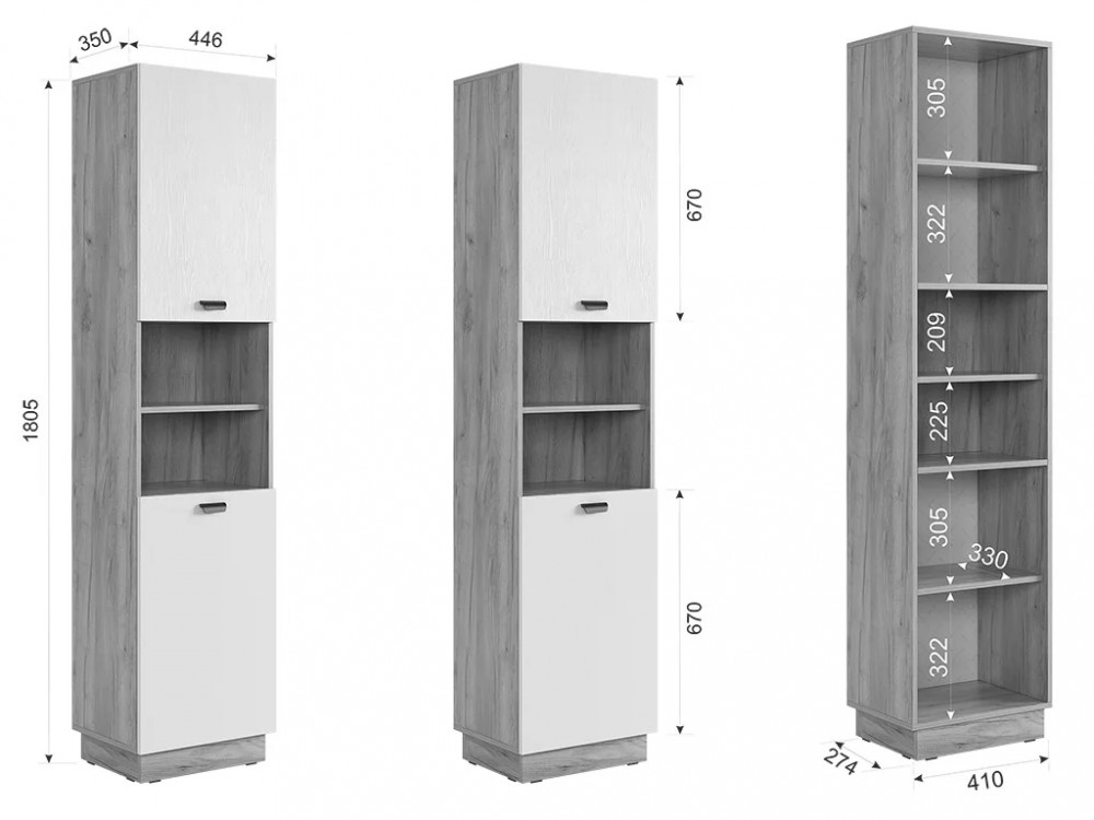 Состоит из: шкафа с 2-мя закрытыми и 1-ой открытой секцией со съемной полкой.