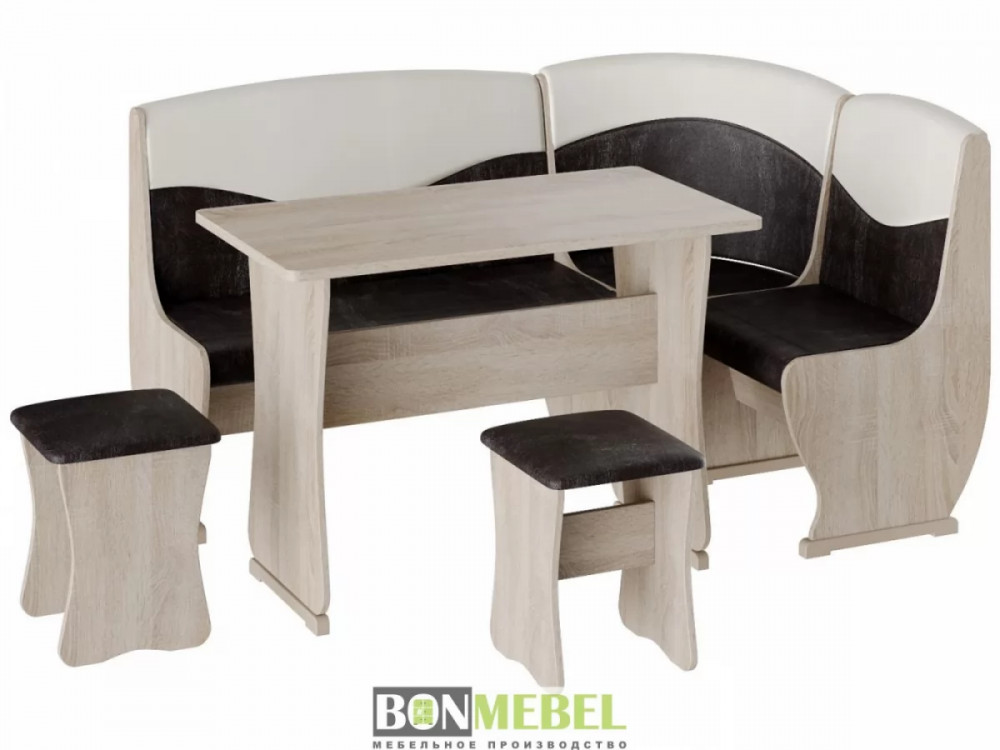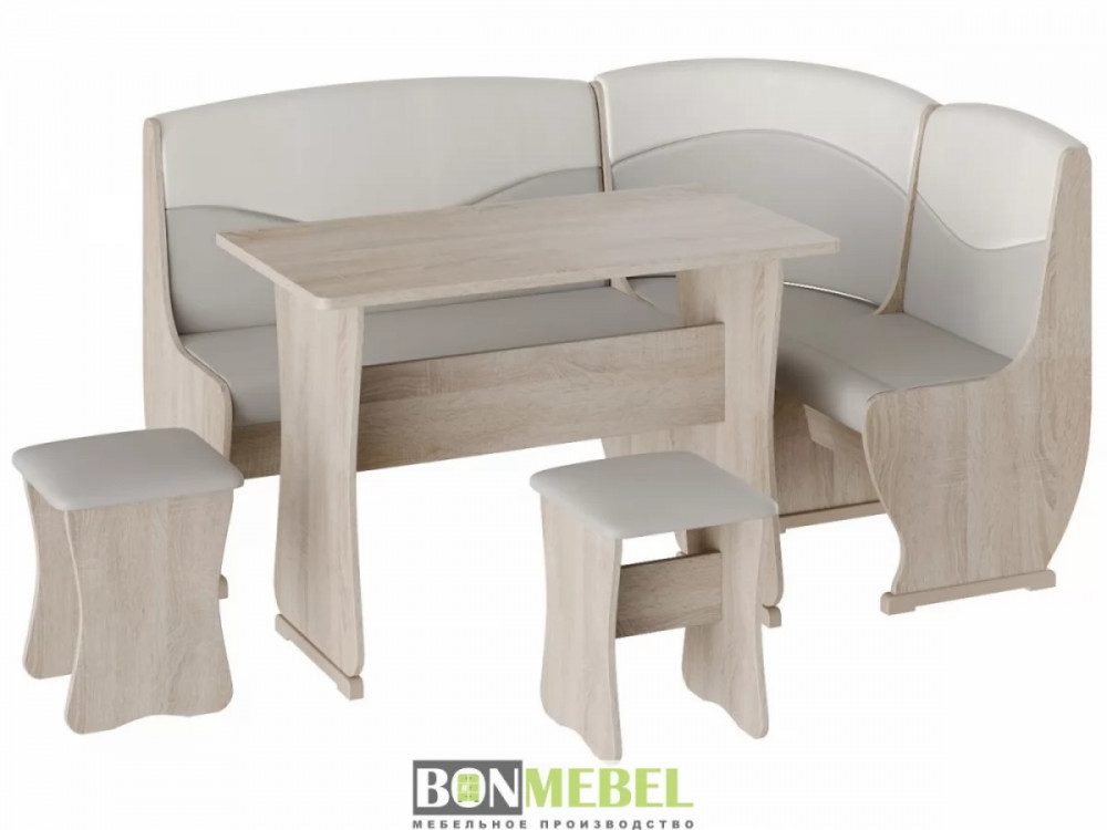 Кухонный уголок Уют тип 2 с обеденным столом и двумя мягкими табуретами. Каркас уголка, стол и табуреты изготавливаются из ЛДСП. Универсальный тип сборки — скамью можно собрать как длинной стороной слева, так и справа; ящики под сиденьями — полезная деталь для хранения мелочей на кухне; обивка из экокожи — практичная и легкая в уходе, особенно на кухне.