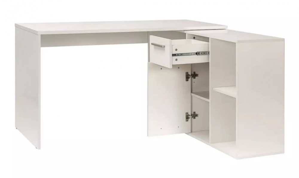 Универсальный рабочий стол, который можно собрать как в угловой, так и в прямой ориентации. Широкая столешница позволит свободно разместить ноутбук, настольную лампу и письменные принадлежности. Система хранения стола состоит из тумбы с четырьмя открытыми нишами разного размера, одного закрытого шкафчика с полкой внутри и выдвижного ящика.