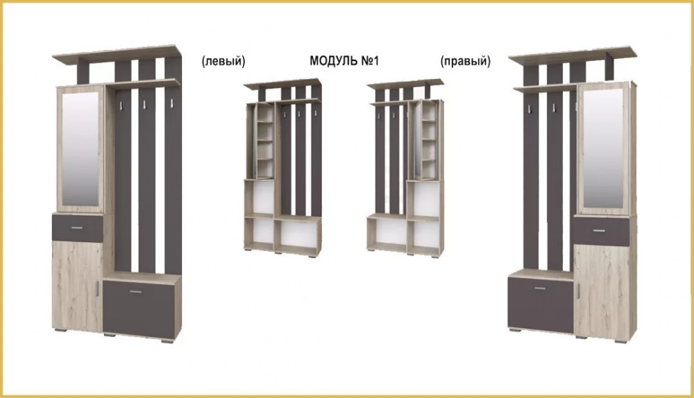Состоит из 2-х модулей, шкафа и вешалки. Фасад с зеркалом имеет поворотный механизм, к которому прикреплены полки. При повороте зеркало смещается в шкаф, а перед вами остаются полочки.