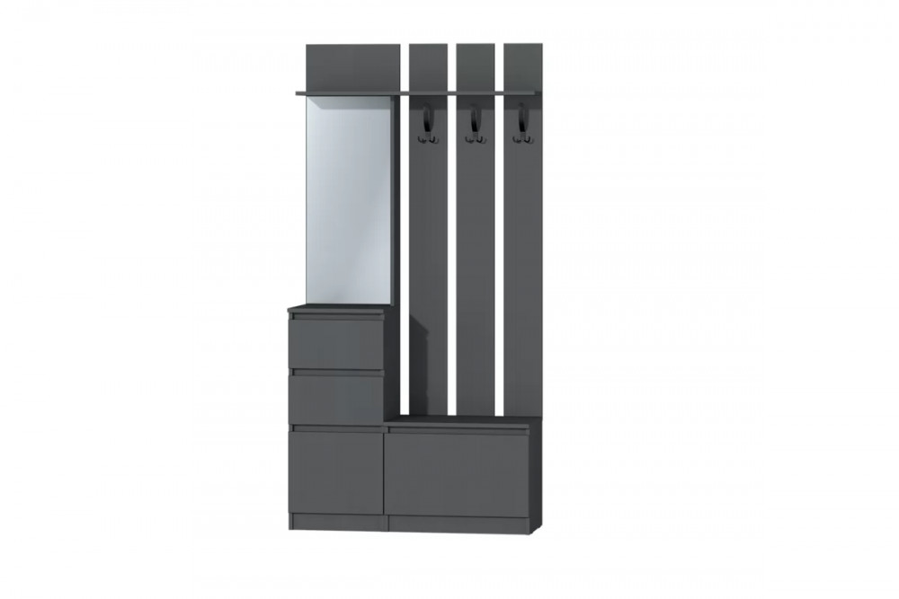 У данной прихожей 2 выдвижных ящика, 1 распашная и 1 откидная створка, отдел с крючками для верхней одежды.