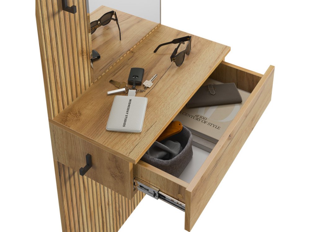 Крючки предоставляют удобное место для хранения сумок или аксессуаров. Выкатной ящик служит дополнительным пространством для хранения мелочей, таких как ключи, кошелек, косметика или другие небольшие предметы.
