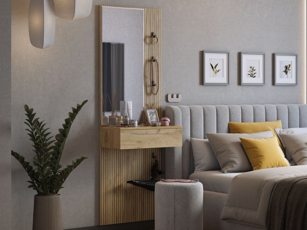 Принт, имитирующий вертикальную фрезеровку, придает зеркалу уникальный и современный вид, добавляя текстуру и глубину. Материал каркаса – ЛДСП, что обеспечивает прочность и долговечность, а также легкость в уходе.