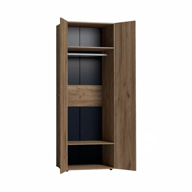 Двухстворчатый шкаф для одежды 54 прекрасно подойдет для хранения одежды и белья в спальне. Гладкие фасады и натуральный декор шкафа привнесут в комнату особый уют и теплоту, а металлические ручки-скобки вместе с 2 мм кромкой ПВХ обеспечат высокую надежность изделия. Распашной шкаф комплектуется стационарной штангой длиной 757 мм, на которой можно разместить до 10 плечиков с верхней одеждой, а также двумя полками - сверху и снизу. Регулируемые опоры компенсируют незначительные неровности пола.