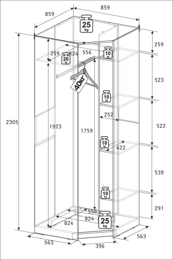 *Размеры (ВхШхГ), мм:2305х859х859 мм