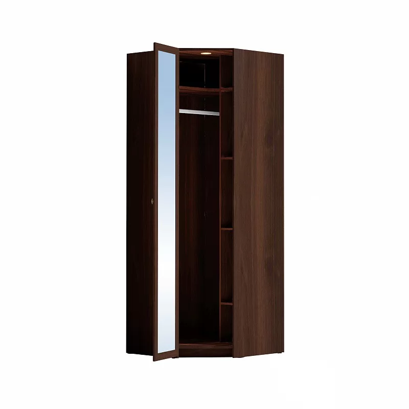 Угловой высокий шкаф использует рационально самую сложную площадь в комнате - угол. Он комплектуется внутренним стеллажом с регулируемыми по высоте полками и стационарной штангой для верхней одежды. Длина штанги 817 мм, что позволит свободно развесить более 10 плечиков с зимним гардеробом. Беспроводной светодиодный светильник поможет сориентироваться и быстро найти необходимое. Он включается только при открытой двери. Легкая установка светильника на магнитное крепление - не требует сверления, прокладывания провода, подключения к сети.