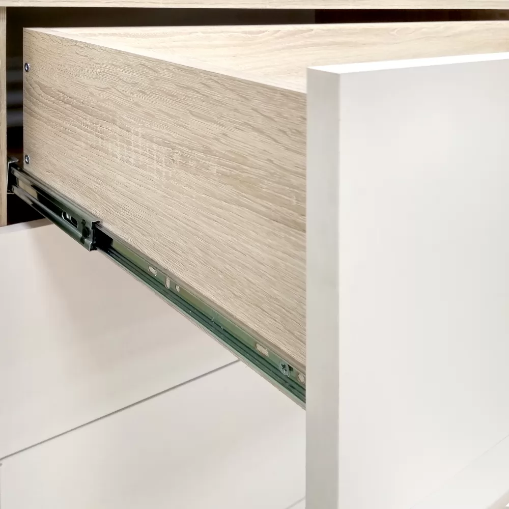 Выкатные ящики работают на шариковых направляющих полного выдвижения - тихих, надежных, позволяющих увидеть и использовать все пространство ящика.