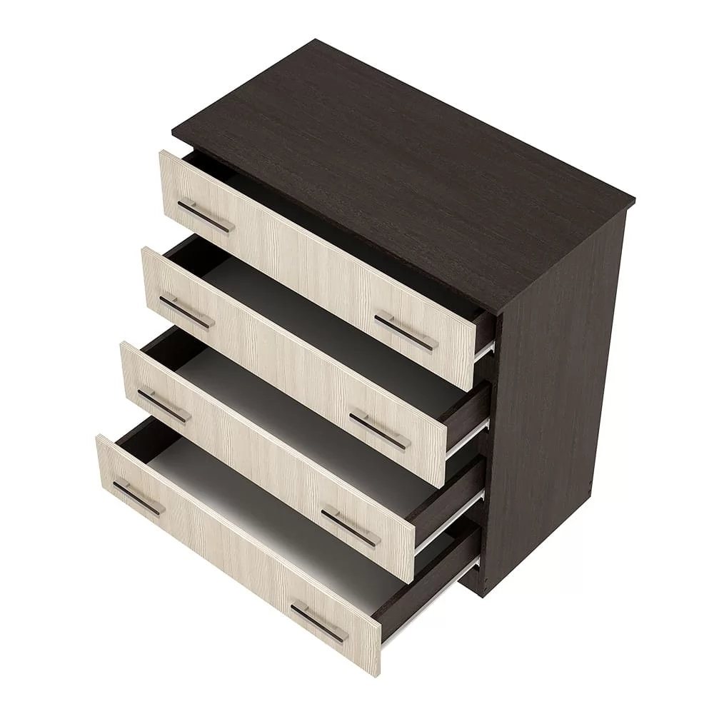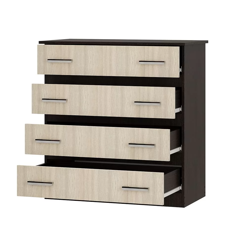 - комод состоит из четырех выдвижных ящиков, на каждом из которых расположены две ручки,