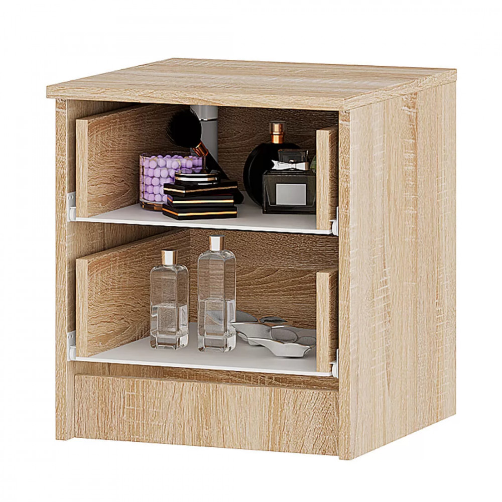 Вы сможете разместить в них необходимые вещи и аксессуары, которые должны быть под рукой. Модель выполнена из ЛДСП двух классических цветов сонома и белый. Два выдвижных ящика оснащены эргономичными ручками.